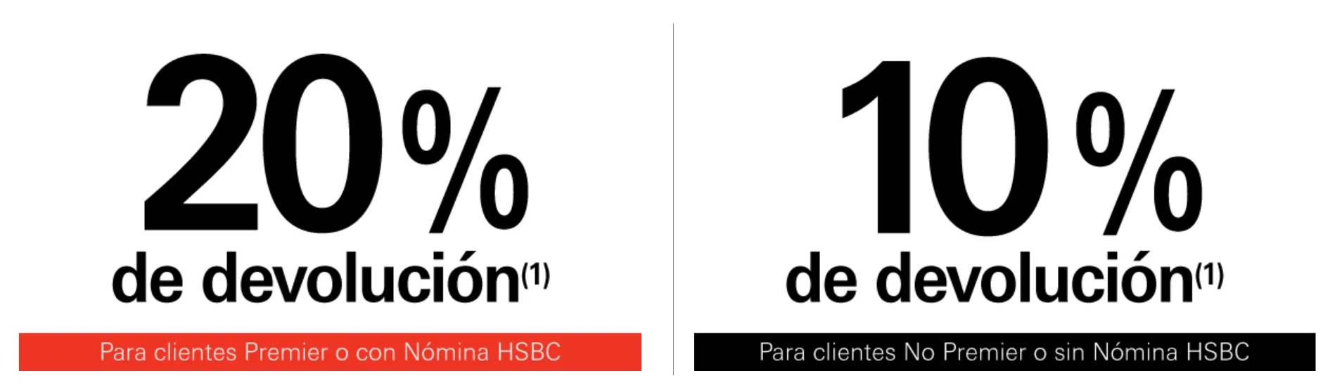 Si recibes tu nómina en HSBC o eres un cliente Premier, puedes obtener 20% de bonificación al acumular $12,500 gastados a meses sin intereses en plazos de 6 a 24 meses, solo en comercios participantes.