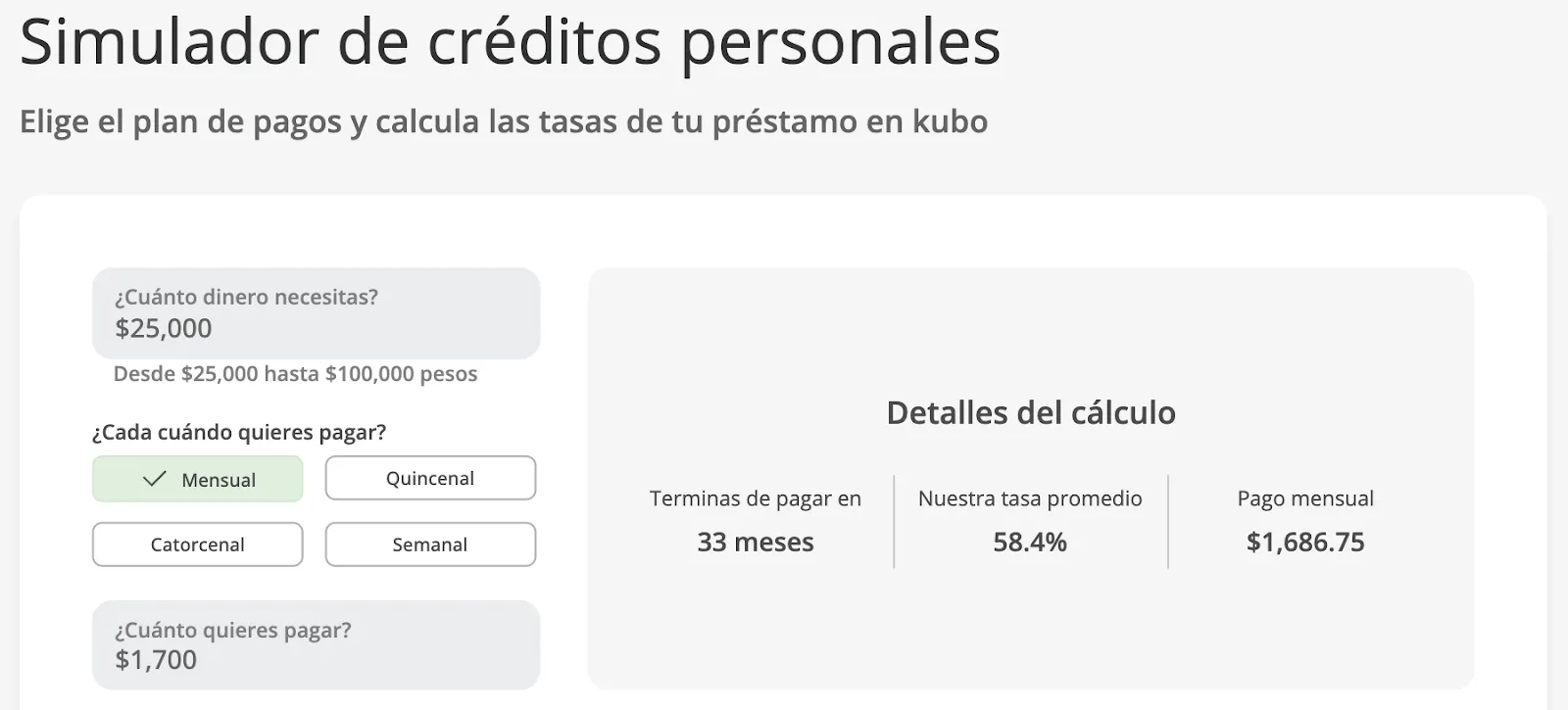 Kubo ofrece un simulador interactivo que te permite calcular los costos aproximados de tu préstamo, incluyendo mensualidad, plazos e intereses. Sin embargo, algunos usuarios han comentado que no deja claro que ciertos campos son ajustables, como el monto o el plazo del préstamo.