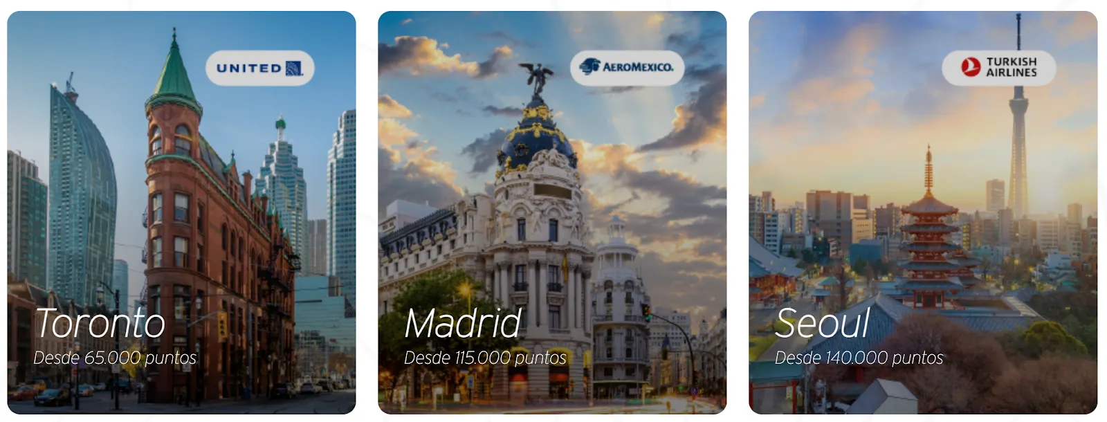 También puedes utilizar tus puntos directamente para comprar vuelos, la equivalencia más o menos en destinos nacionales es de 32,000 puntos por ejemplo a Guadalajara o Puerto Vallarta. También puedes utilizarlos para destinos internacionales, por ejemplo por 45,000 puntos puedes volar a Miami, por 65,000 puedes ir a Toronto, a Madrid con 115,000 y a Seúl por 140,000. Estos vuelos no se limitan a una sola aerolínea, dependerá del destino que elijas. ¡Chécalos aquí!